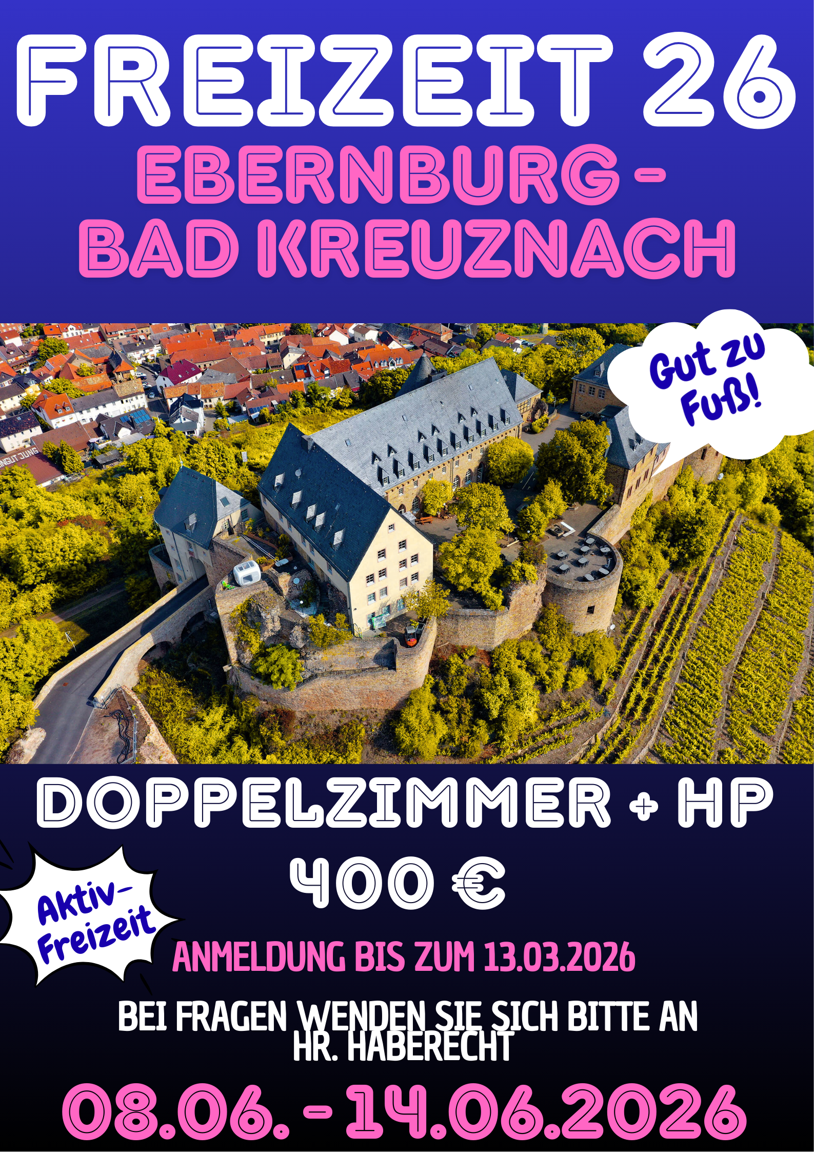 Vom 08.06. bis 14.06.2026 findet unser gemeinsamer Freizeitausflug nach Ebernburg bei Bad Kreuznach statt. Das Angebot richtet sich an unsere Teilnehmer*innen und Beschäftigten, die eine Woche Abstand vom Alltag nehmen und neue Eindrücke sammeln möchten.