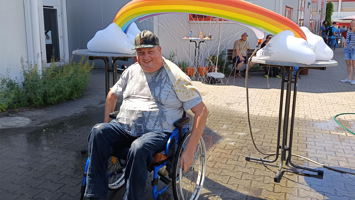 Einmal mit Vollgas strahlend unter den Regenbogen fetzen! Herr P. zeigt, wie man sich bei warmen Temperaturen richtig gut erfrischen kann.
